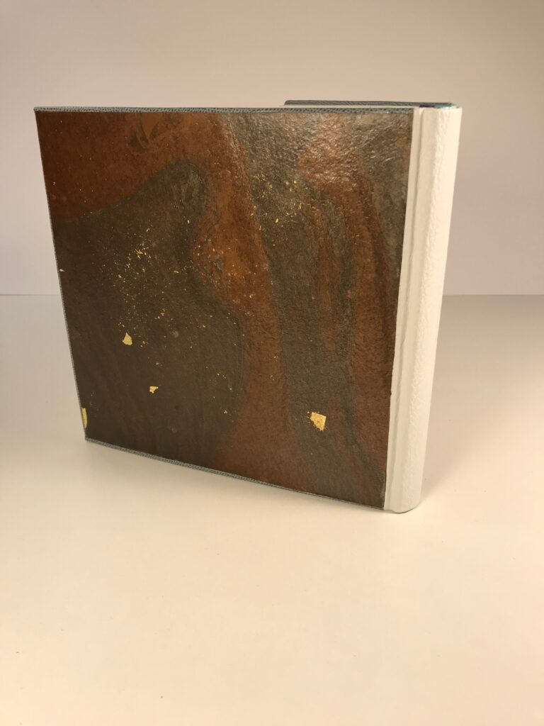 A droite: reliure à plats rapportés, ais en feuille de pierre avec des inserts à la feuille d’or 22 carats, tranchefile à chapiteau brodée main, gardes avec inserts en soie de cactus.